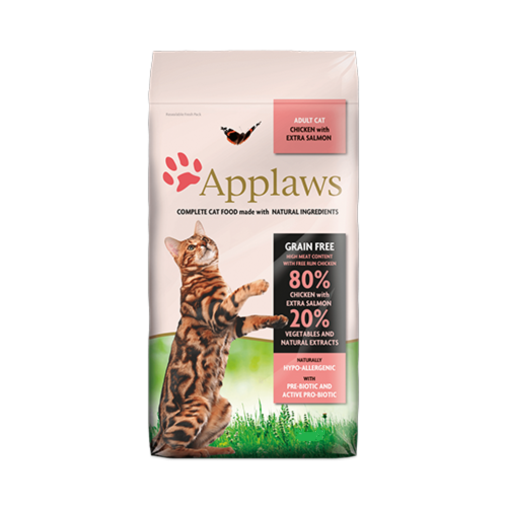 - يحتوي على 80% من البروتين الحيواني الحقيقي من الدجاج والسلمون.
