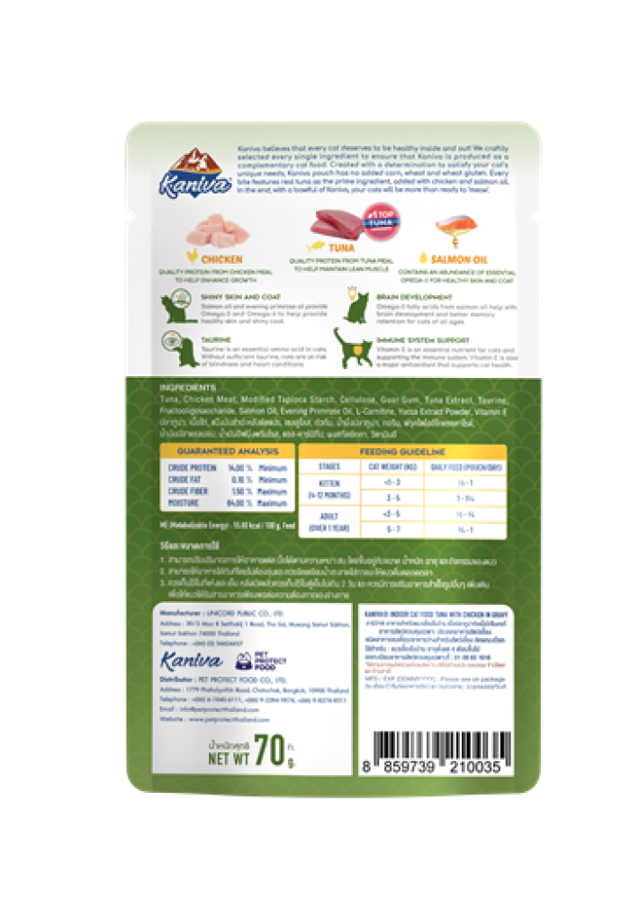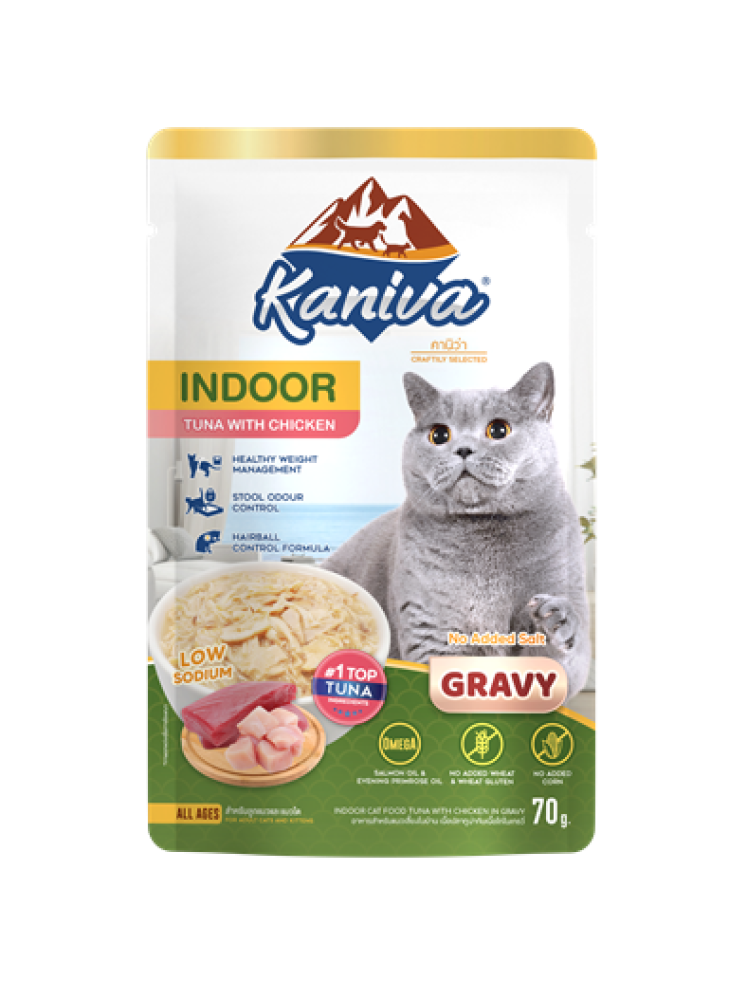 مع Kaniva Indoor Wet Food for Cats، تحصل قطتك على تغذية متكاملة وخالية من الذرة والقمح والجلوتين، مما يجعلها مناسبة حتى للقطط ذات الجهاز الهضمي الحساس.